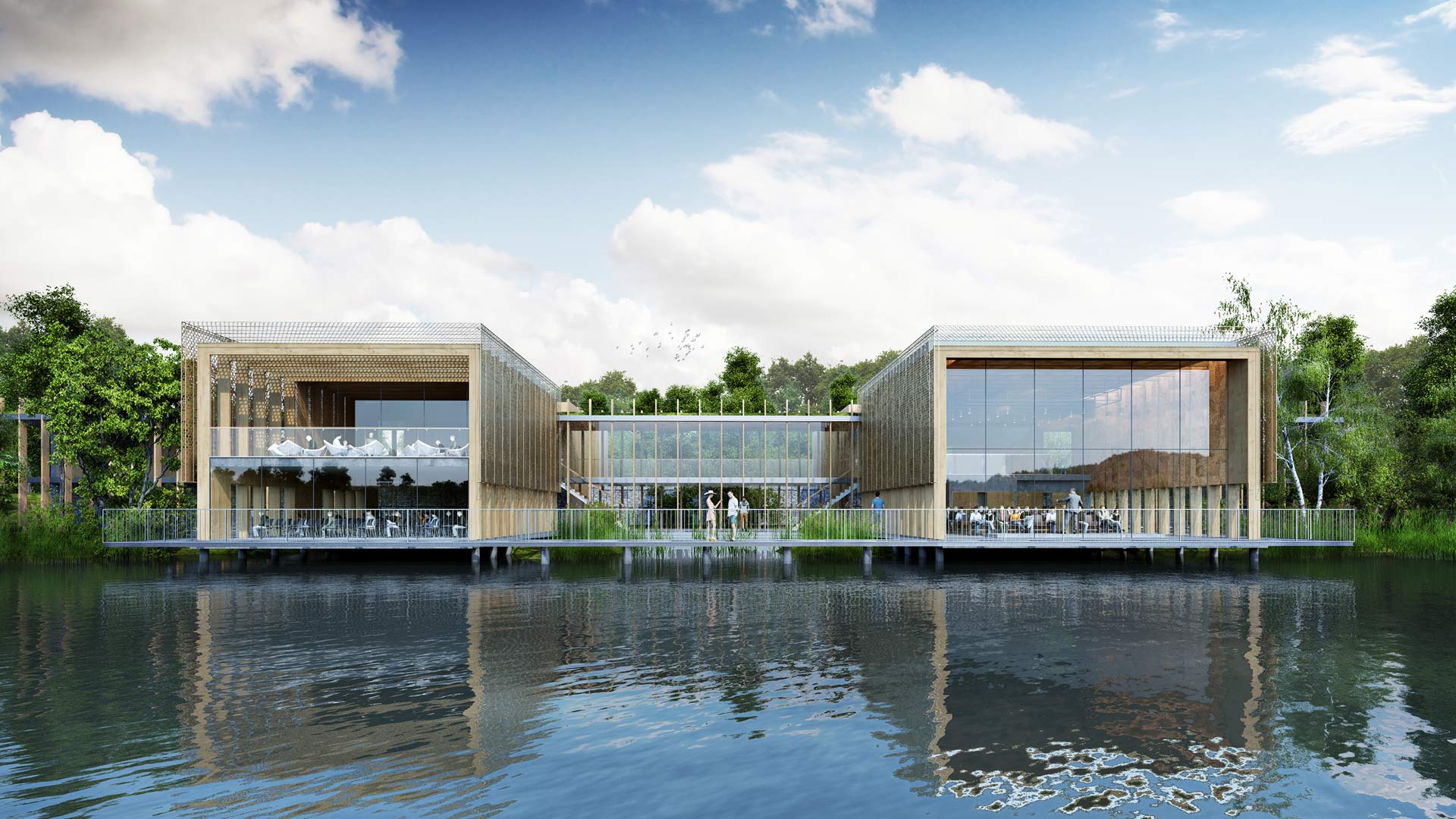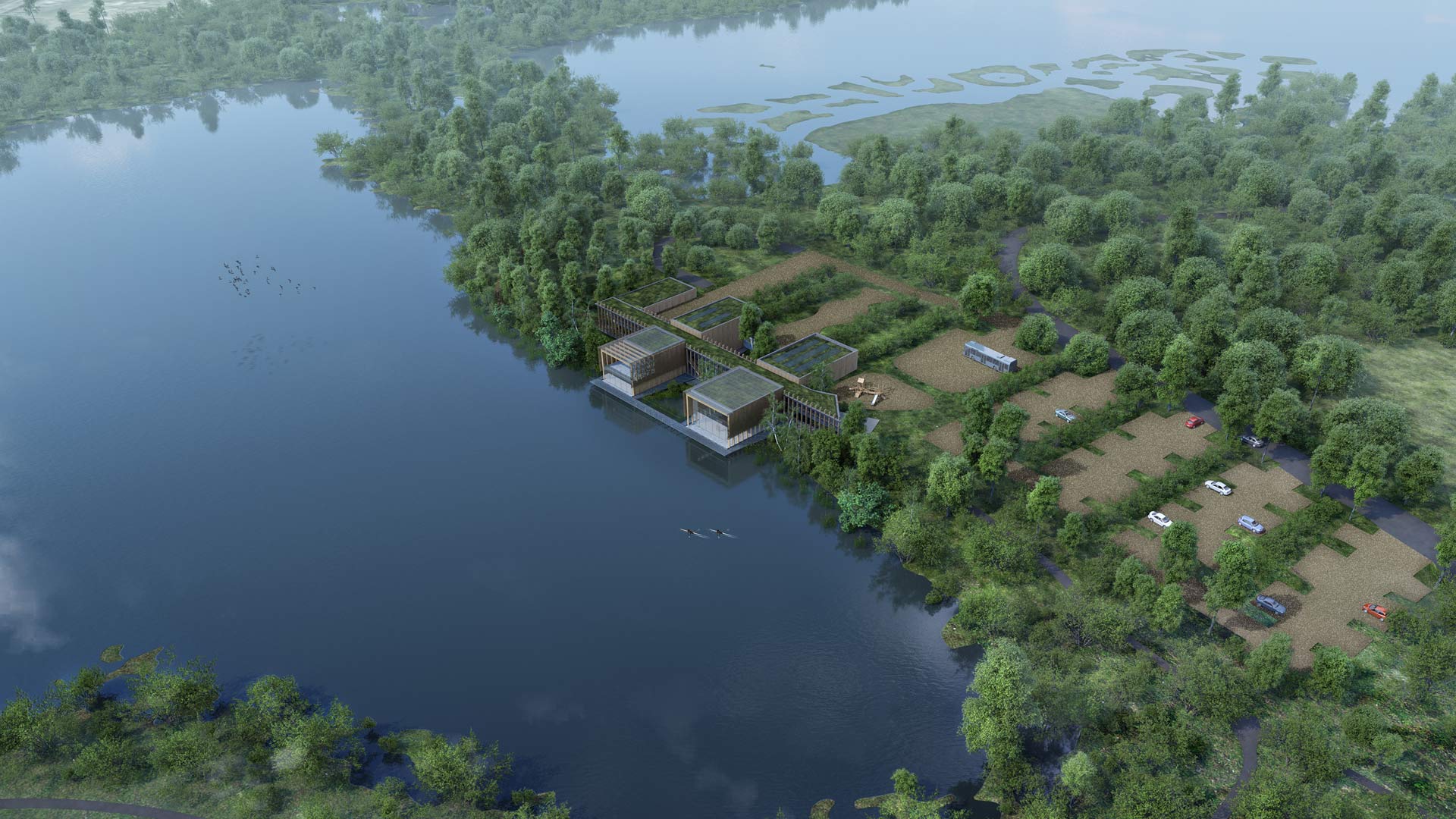 • TYPE: RIBA COMPETITION STATUS: DESIGN ROLE: LEAD ARCHITECT This RIBA competition design proposal provides a visitor and wellbeing centre which fits with the surrounding wildlife reserve in Sevenoaks with a long-term vision connecting old and new activities to enhance the visitor experience. The design proposal aims to provide an engaging and friendly environment which encourages self-improvement, participation in events and promoting health & wellbeing education. The three main key areas of the centre are: ‘Spine’ - a covered walkway to guide visitors to the important parts of the building. ‘Hide’ - enveloped structures inspired by bird hides containing flexible spaces and zones. ‘Beaver dam’ - making the lake become part of the centre by creating a wading pool allowing visitors to to be closer to local wildlife. The building will consist of living grass roofs to reduce surface water run off with retro fitted photovoltaics and solar thermal collectors to provide heating and electricity. Planting is encouraged to grow up the walls and roof providing natural habitat and nestling the building into the site. Earth warmed natural ventilation is introduced through clay pipes built under the building and discharged through the roof lights. Thick walls provide a stable thermal environment reducing cooling and heating costs.