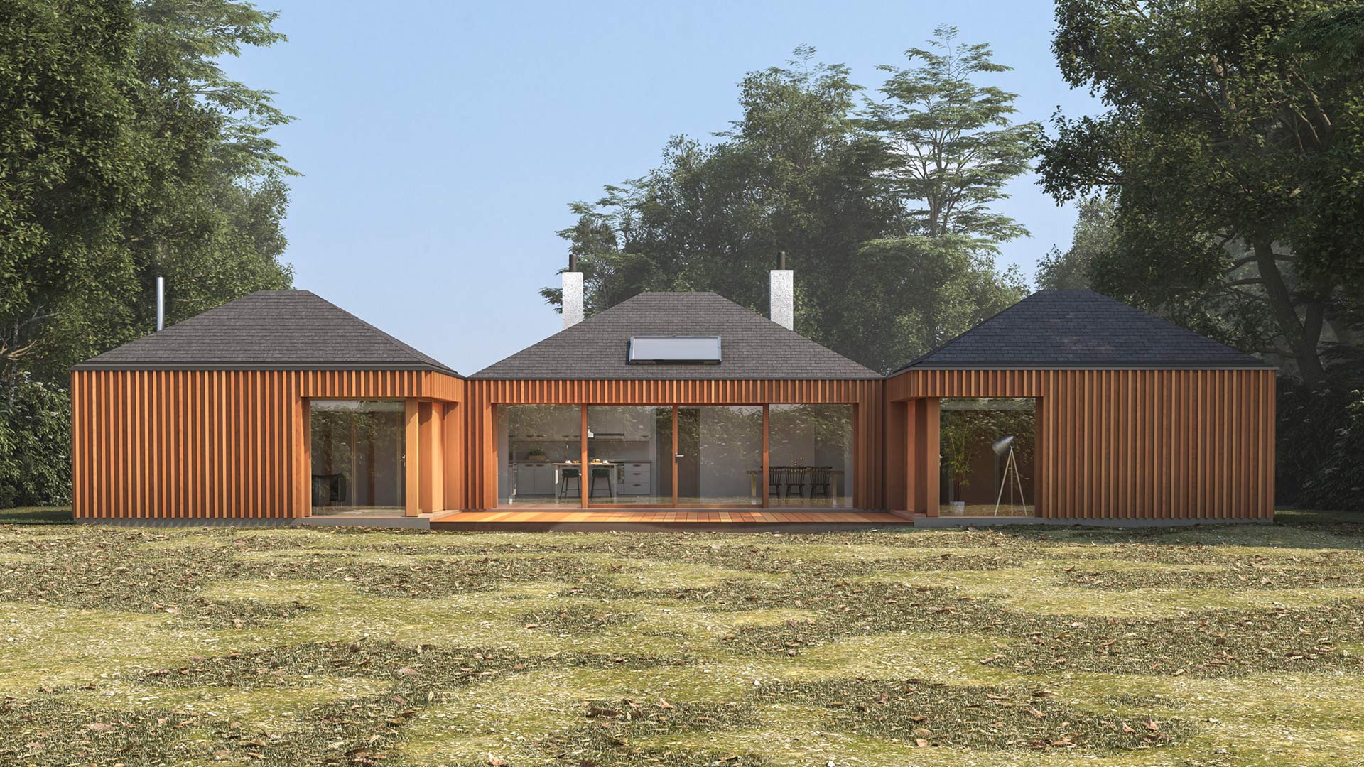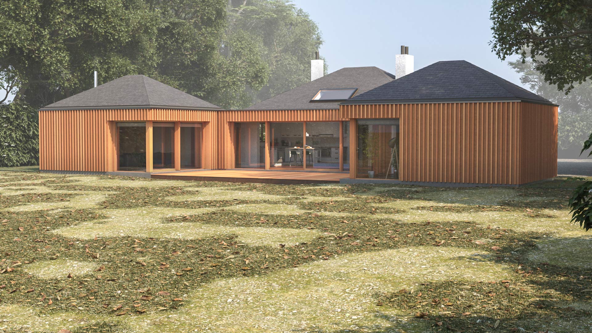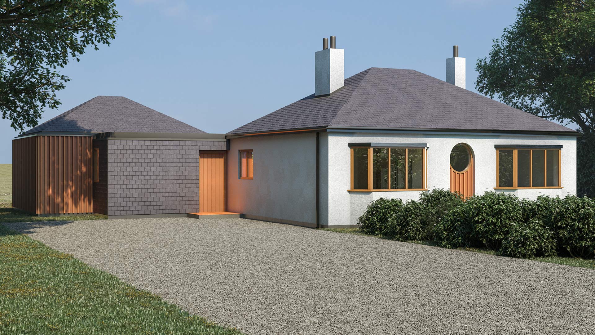 • TYPE: DWELLING STATUS: RIBA STAGES 1-3 ROLE: LEAD ARCHITECT Extension to two-bedroom bungalow on the outskirts of Spalding in the countryside. The plot was quite large which enabled more flexibility in terms of the design. The design proposal is to add two smaller hipped roof structures to mimic the existing bungalow roof creating a courtyard and more views out onto the garden and the countryside. The new hipped roof structures accommodating a lounge on one end and master bedroom at the other end were connected to the existing building by a flat roof structure with a parapet which also incorporated a utility room at one end and an en-suite for the main bedroom at the other end. The existing bungalow is to be reconfigured creating an open plan kitchen and dining area which faces the courtyard and two bedrooms towards the front with a bathroom in the middle. Two front doors were relocated at either side of the front building. Planning permission was approved.